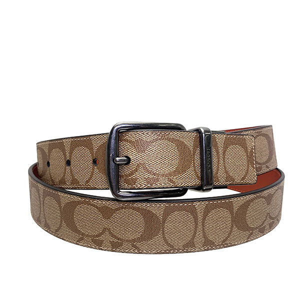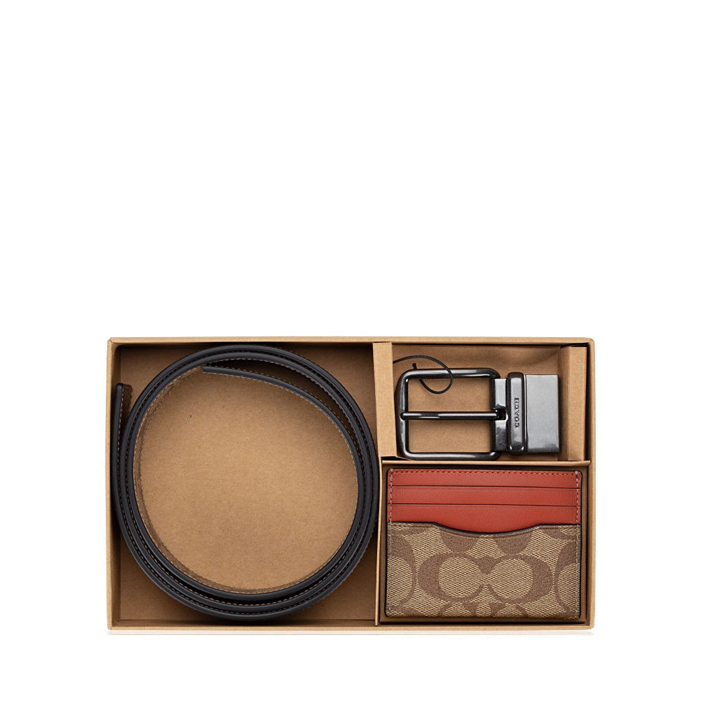 Signature coated canvas and refined calf leather, Three cards slots,ID window, and belt Signature coated canvas and refined calf leather, Cut-to-size, Reversible.