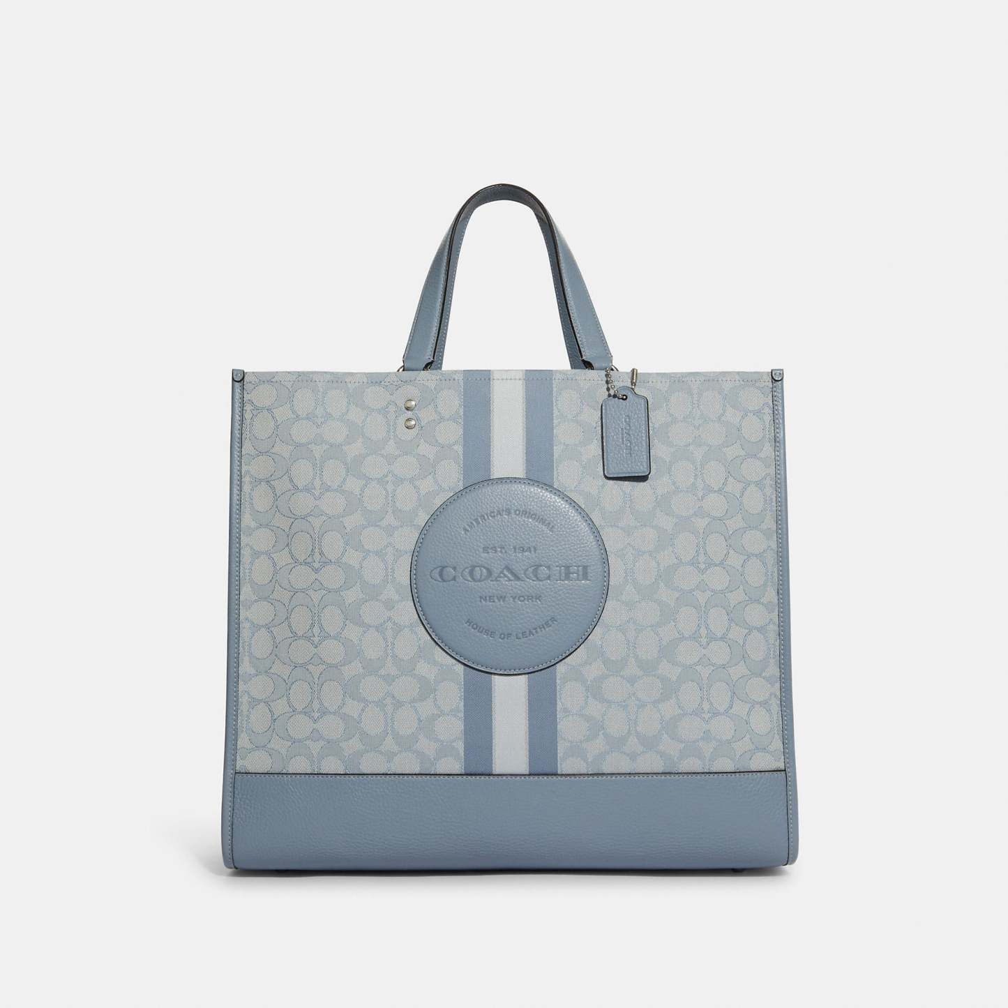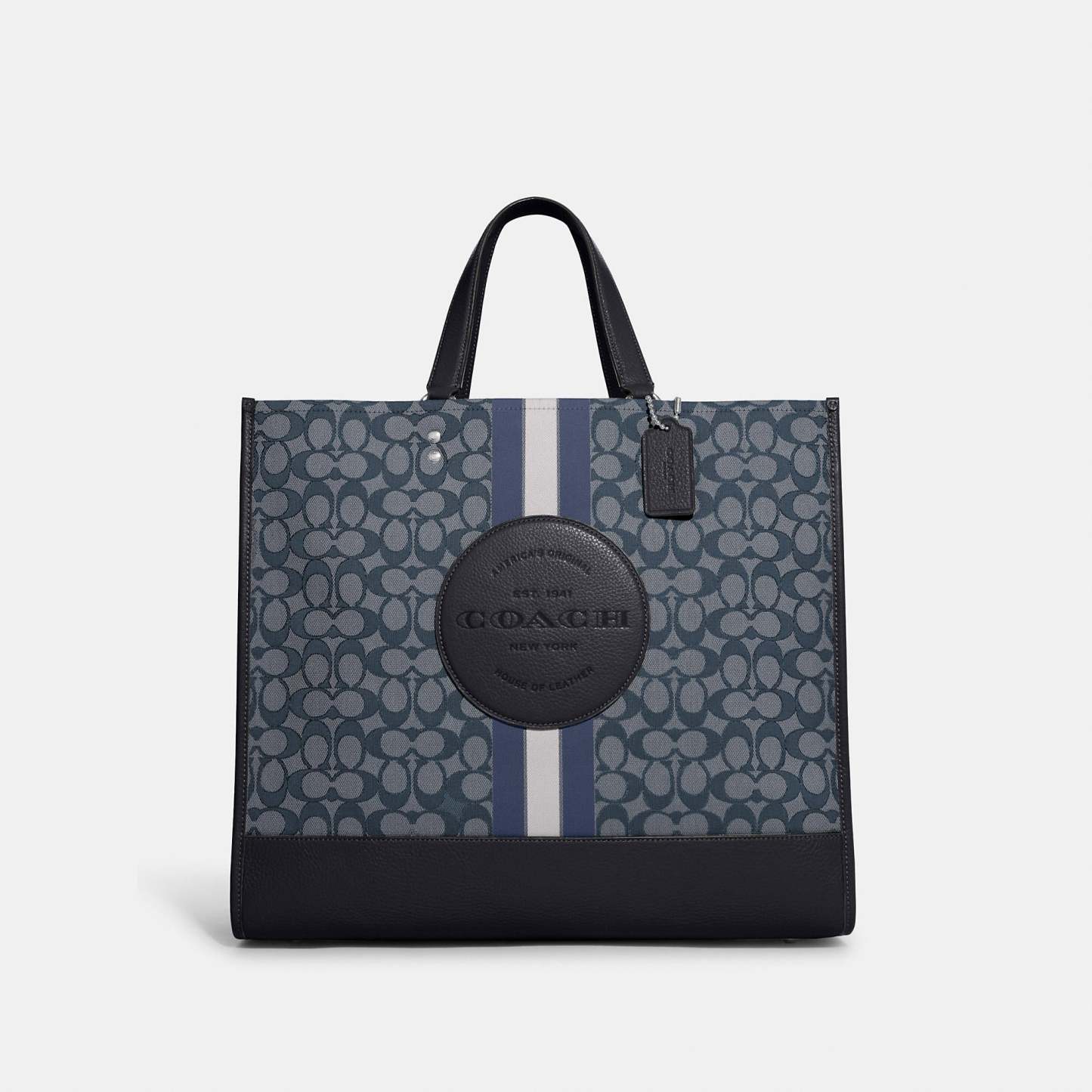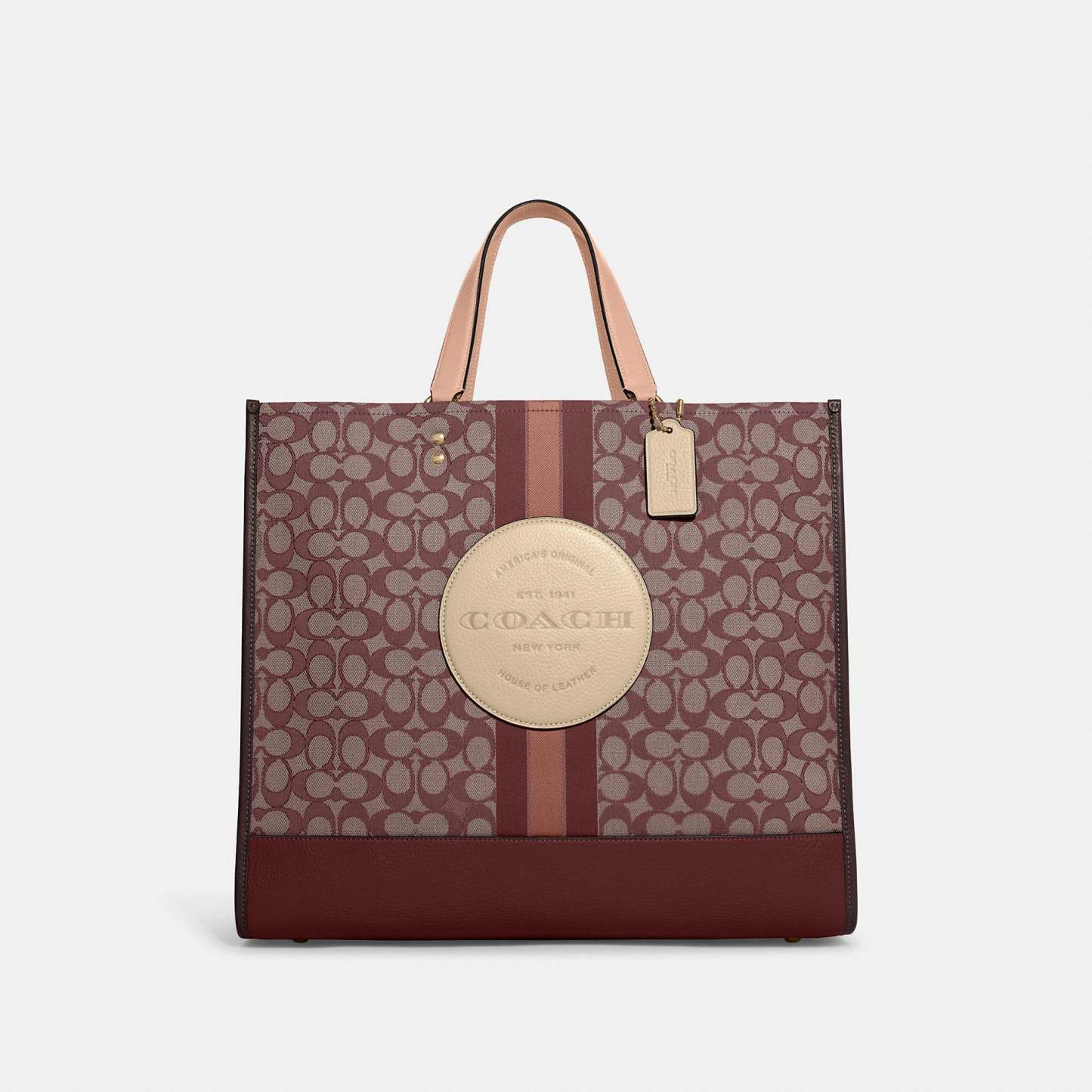 Signature jacquard and refined pebble leather Inside zip cell phone and multifunction pockets Snap closure fabric lining Handles with 6 drop Detachable strap with 20 1/2 drop for shoulder or crossbody wear Four protective feet at base 15 3/4 (L) x 14 (H) x 7 1/4 (W) This piece is crafted of our Signature jacquard made from a blend of organic cotton and recycled polyester Style No. C8418 | Outlet Dempsey Tote 40 In Signature Jacquard With Stripe And Patch - Brown