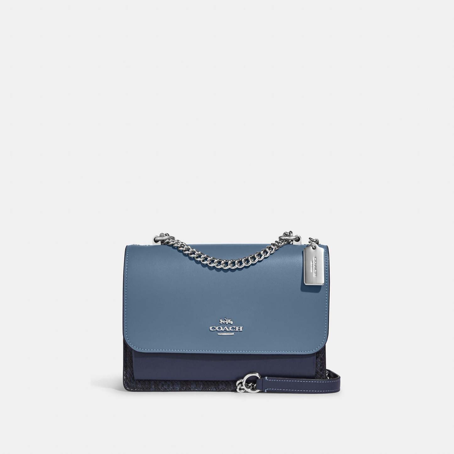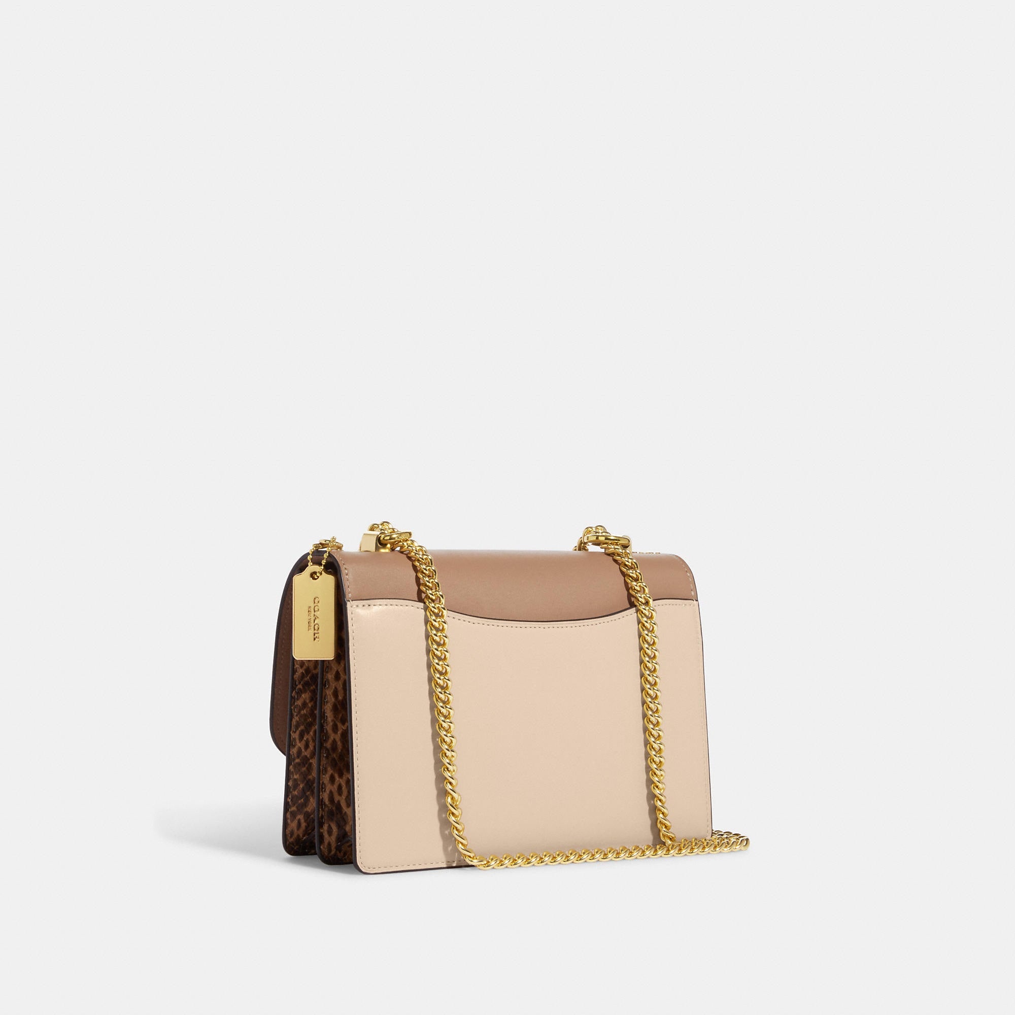 Smooth leather and snake-embossed leather Inside zip and multifunction pockets Snap closure fabric lining Outside slip pocket Strap with 22 drop doubles up for three ways to wear - short or long on the shoulder or crossbody style 8 1/2 (L) x 6 1/4 (H) x 2 3/4 (W) Style No. CB900 | Outlet Klare Crossbody In Colorblock - White
