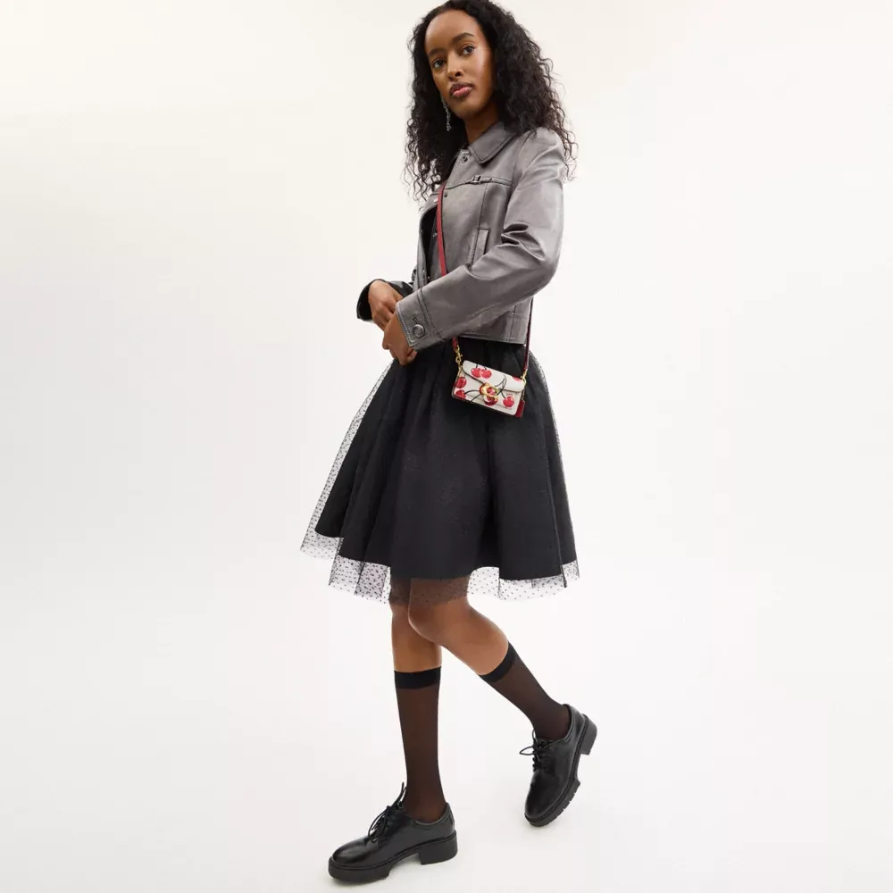 Mini me. We made a scaled down version of our customer-favorite Tabby bag with all of the same details as the original. Finished with our Signature hardware for an iconic touch, it’s crafted of polished pebble leather printed with a cheerful cherry motif detailed with glittery accents for a touch of sparkle. The versatile design features two detachable straps to carry by hand or wear crossbody and a dual gusset interior to organize cash, cards, ear buds and keys. (Great things come in small packages.)